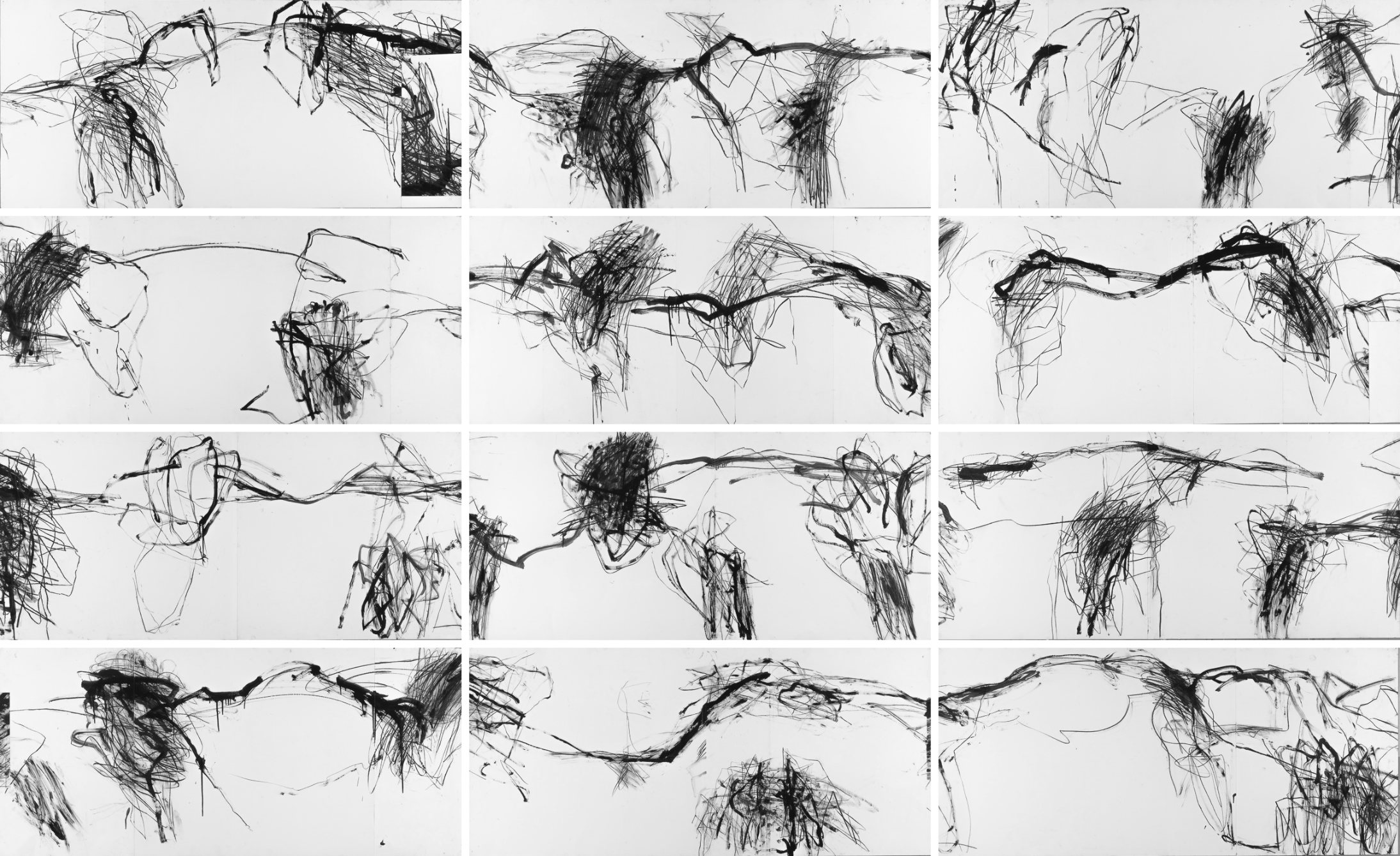 Die 12 Zeichnungen (Kohle und Öl auf Papier, je 155 × 70 cm) sind Ergebnis eines fortlaufenden Arbeitsprozess.