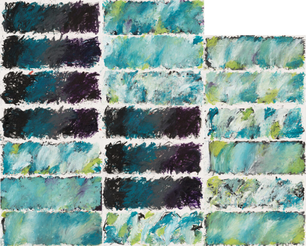 Hier 20 Doppelseiten, Öl, Bleistift auf Papier, je 100 × 35 cm. In dieser Anordnung, ohne Abstand gehängt, betragen die Maße der Wandarbeit ca. 300 × 245 cm.