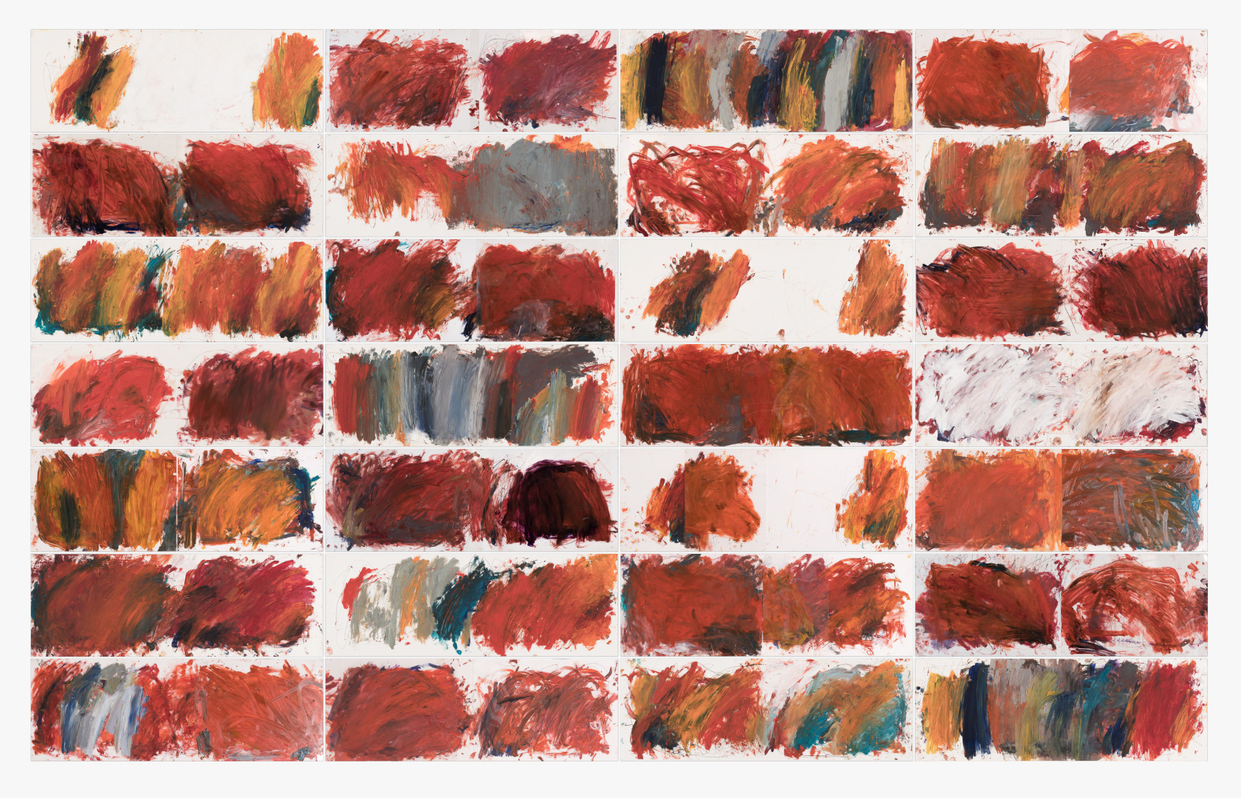 Pages, hier 28 Doppelseiten, Öl, Bleistift auf Polyesterfolie und Papier, je 100 x 35 cm. In dieser Anordnung betragen die Maße der Wandarbeit ca. 4,06 × 2,57 cm.